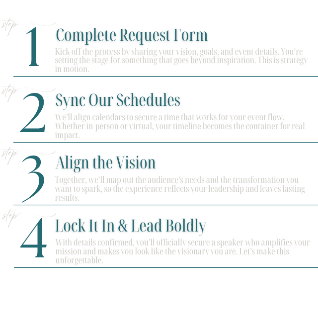 You’re creating a shift. We are here to intentionally align with your desired outcome while speaking from a space of authentic and intentional experience. By intentionally opening this space, you’re offering your audience more than inspiration. You’re inviting clarity, connection, and the elevation that transforms long after the room clears.