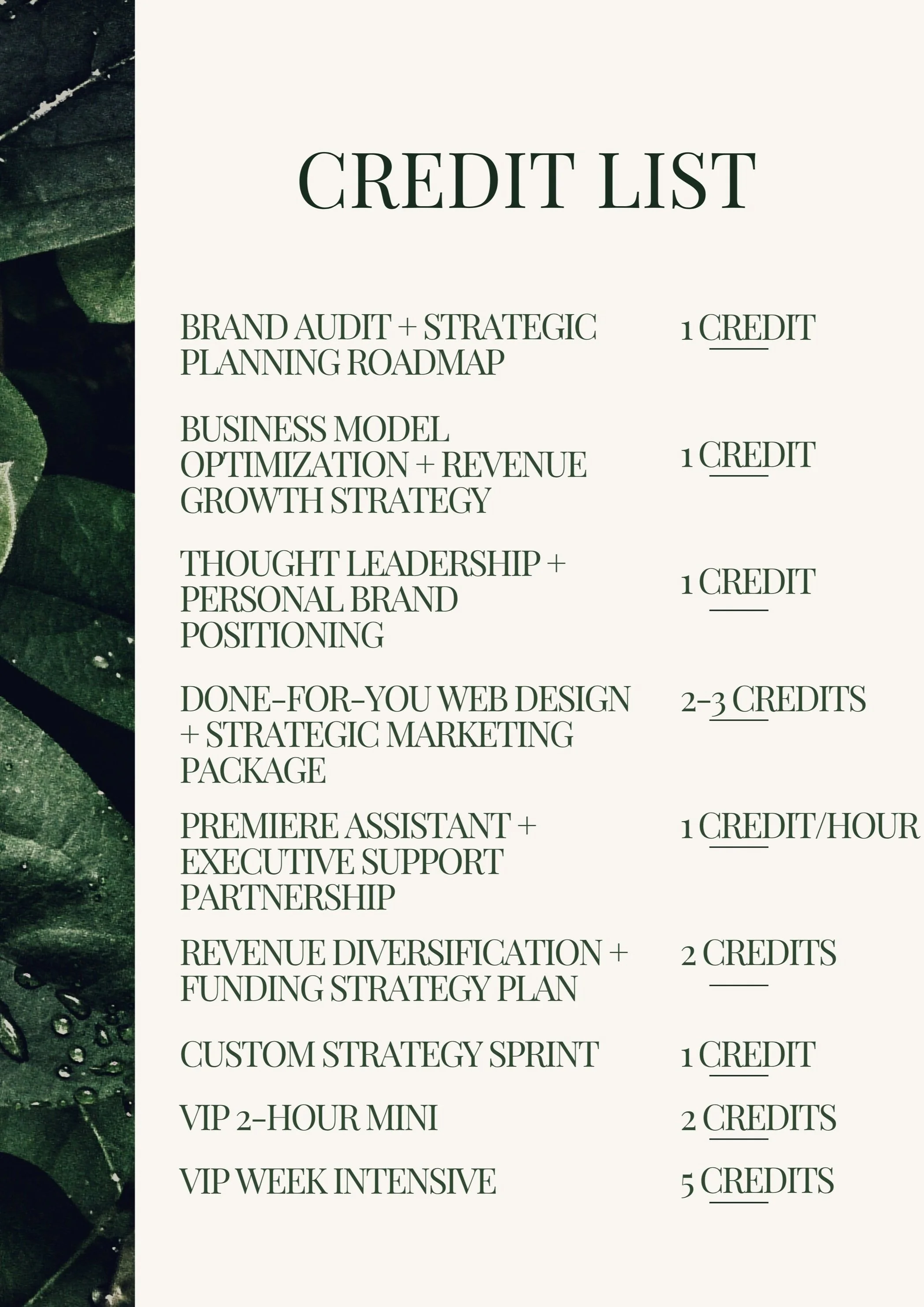 Whether you’re ready to map out your next offer, revamp your brand, get strategic around funding, or delegate with confidence, credits allow you to move with flexibility and purpose.